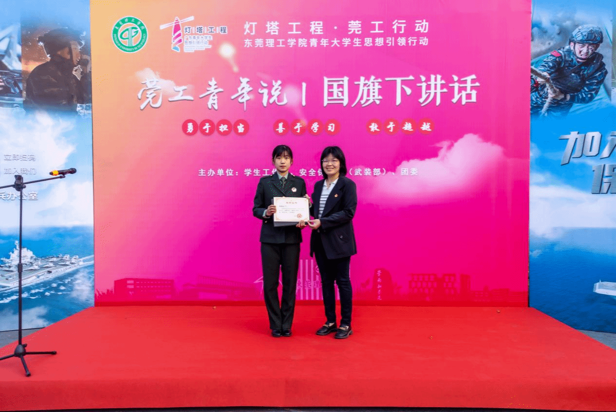 升旗仪式后,经济与管理学院22级经济与金融4班的陈俊妃同学登上莞工青年说的舞台,以《复兴征途,砥砺前行》为题进行演讲。陈俊妃同学表示,国防是一个国家的根本,维护国家安全是每一位中国人的责任与义务,青年作为国家的中坚力量,应当秉持着爱国爱民、无私奉献的精神不懈奋斗、追求卓越,为祖国的繁荣发展贡献力量。最后,陈俊妃同学鼓励同学们主动响应党的号召,积极应征报名,投身于祖国的国防建设之中,携手共创祖国新辉煌。