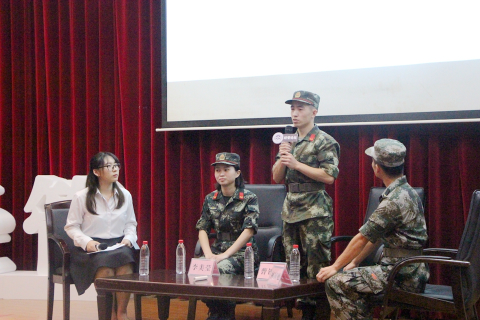 进入分享环节,曹锐冠同学回忆自己从看到征兵标语、报名应征、再到新兵训练后参与各类任务、最终退伍归来的经历。林国勉同学讲述自己体验到的军旅生涯的苦与甜。李美莹同学则从女兵的角度,阐释了军人对于国家的责任与义务,怎么在两年时间内如何将自己做到最好。“0.4厘米”、“直角”等字眼更加突出对士兵的高素质与高要求。在现场的互动交流环节,三位“退伍尖兵”以幽默风趣的方式回答同学们的疑问。军旅生活有苦有甜,这段身披迷彩服的青春记忆必定是人生一段光辉而又自豪经历。军旅生活让他们更了解军人群体,从中感受到军队的纪律性、军人的使命感以及爱国情。