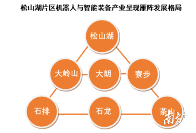 报告指出,松山湖片区总体已形成以松山湖为第一梯队,以周边的大岭山、大朗与寮步镇为第二梯队,以石排、石龙与茶山为第三梯队的雁阵发展格局。纵观整个片区产业分工,松山湖高新区正作为“大脑”引领片区在核心部件上突破,其余六镇则在智能装备制造、集成服务方面不断发力。