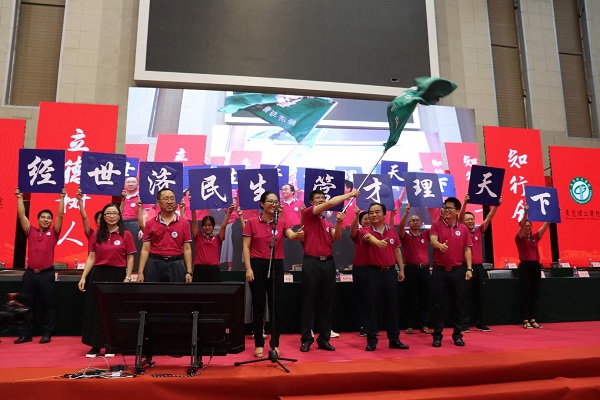 在典礼开始前,台上进行了各学院教师集体亮相。经管学院党总支书记杨继学带领新生班主任、辅导员等老师上台挥舞院旗,挥动院训牌,带动新生们呐喊口号。经管学院六百多新生齐声高呼,洪亮的口号响彻会场。