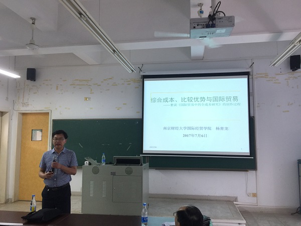 杨青龙博士现任南京财经大学国际经贸学院副教授、硕士生导师、博士生副导师,国际商务硕士(MIB)专业学位点负责人,江苏省高校“青蓝工程”优秀青年骨干教师,兼任中国宏观经济管理教育学会常务理事、中国成本研究会理事、中国价格协会高校价格理论与教学研究会理事、数家知名财经期刊匿名审稿人、《产业经济研究》和《南京财经大学学报》栏目主编。杨博士以《综合成本、比较优势与国际贸易——兼谈《国际贸易中的全成本研究》的创作过程》为题,与与会老师分享了科研创作的方法、途径及国家级课题的申报经验,与会老师受益良多。