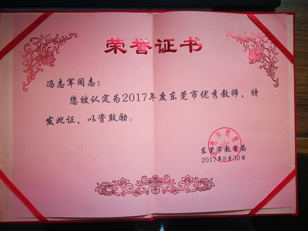 2017年8月30日,yl88858永利集团青年教师冯志军副教授荣获东莞市教育局颁发的2017年度东莞市优秀教师证书。这是yl88858永利集团教师首次获得该殊荣。