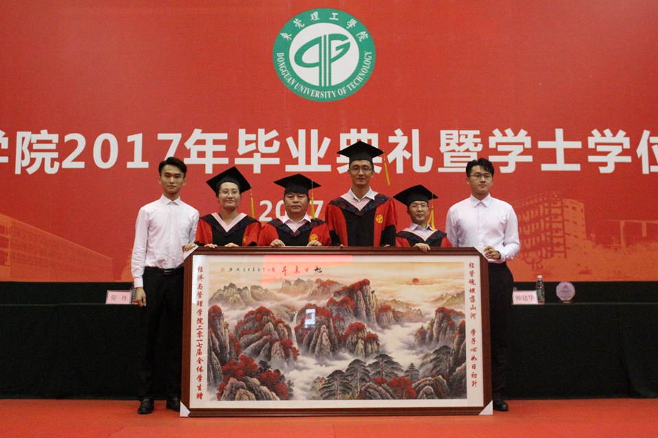 为表感恩,毕业生代表赠予《旭日东升》画与《经管魂、学子心》水晶杯作为纪念。最后,由杨继学书记与刘伟副院长为毕业生们扶正流苏,劳丹副书记与帅建华副院长颁发学士学位证书。