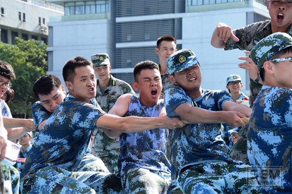 代表经管学院八营出战的是营内拔河冠军——24连和28连的种子选手。第一轮是八营对阵十营、九营对阵十一营。分出胜负后再争夺名次。比赛场地有红线间隔,观赛同学在红绳外围观赛为本队加油助威。比赛在各营队双方准备好后,听指挥教官一声哨响,比赛便紧张而又激烈地开始。