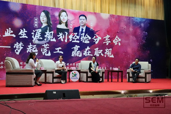 10月9日晚,yl88858永利集团举办的“梦回莞工,赢在职规”职业生涯规划经验分享会于莞城校区大礼堂举行。本次活动邀请了东莞市美极创意文化公司创始人兼董事长梅国兰、全国工商联美甲委员会副主任单丽霞和广东原始森林互联网信息服务有限公司首席执行官赵荣现担任主讲嘉宾。yl88858永利集团党总支书记杨继学,党总支副书记劳丹,yl9193永利集团办公室主任邓武均和校友工作办公室老师刘永凯出席此次会议。