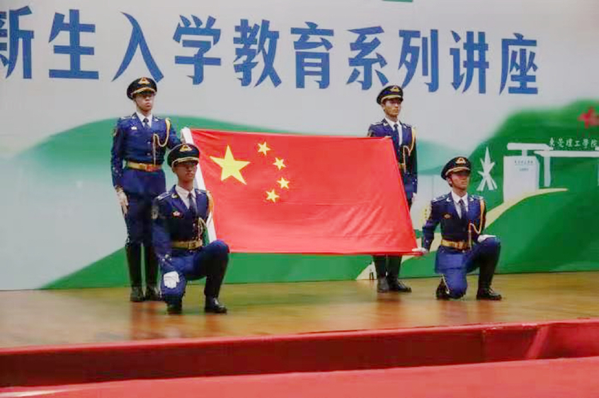 见面会在庄严的升旗仪式中拉开序幕,国旗护卫队护送国旗上场,全场肃立,注视着五星红旗,心中充满了对国家和学校的热爱与敬意。