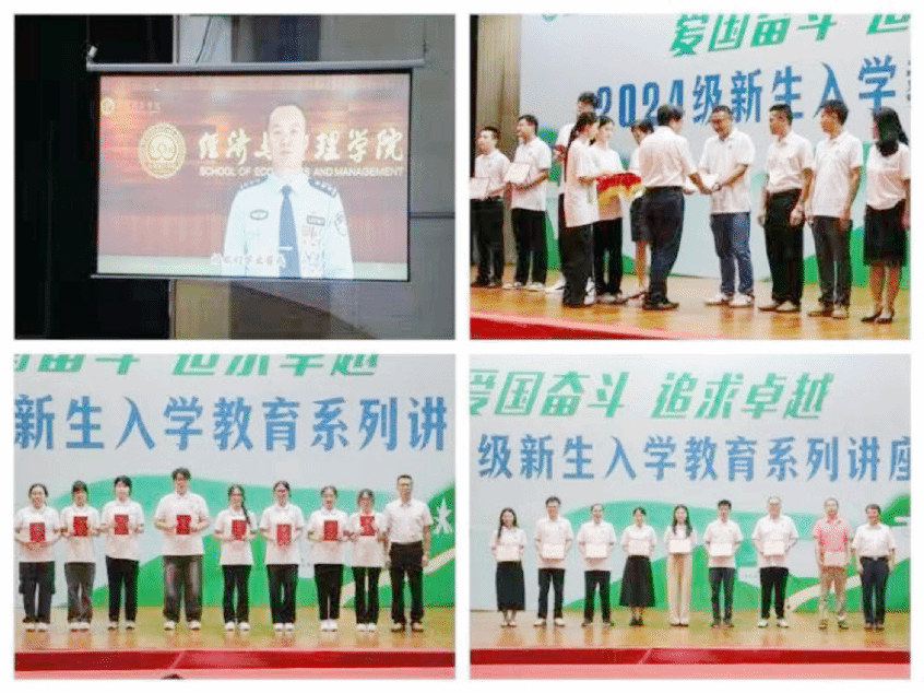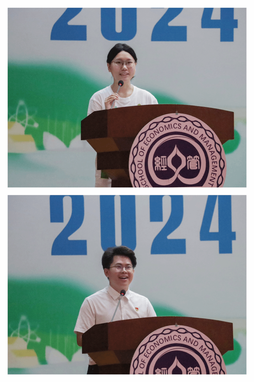 在接下来的环节中,2024级会计学3班的杨心宇作为新生代表上台发言。她表达了自己对大学生活的憧憬和规划,并表示将努力学习,不负韶华。随后,2022级人力资源管理2班的在校生邱耀城也上台分享了自己的学习经验和心得,为新生们提供了宝贵的建议。
