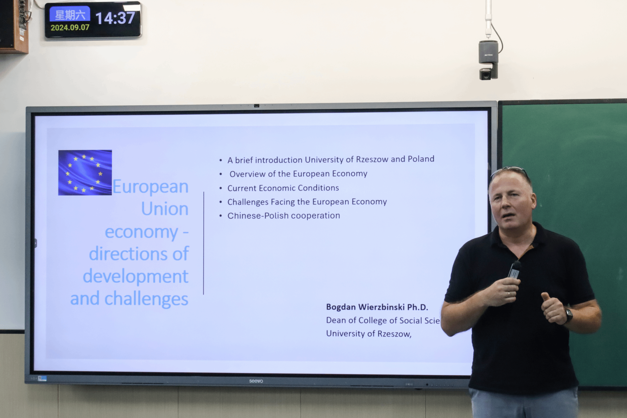 首场讲座以“欧盟经济与一体化进程”为主题拉开帷幕。Bogdan博士为听众们深入剖析欧盟经济的主要情况,回顾了欧洲经济自二战后至今的发展历程,并着重强调欧洲一体化进程对经济增长的积极作用。他指出,欧盟的成立极大地促进了成员国之间的贸易往来和区域合作,为欧洲经济的稳定增长奠定了坚实基础。随后,Bogdan博士分析了当前欧洲经济面临的主要挑战,包括全球经济不确定性、地缘政治紧张以及气候变化等问题,并呼吁各国政府和国际组织共同努力应对。