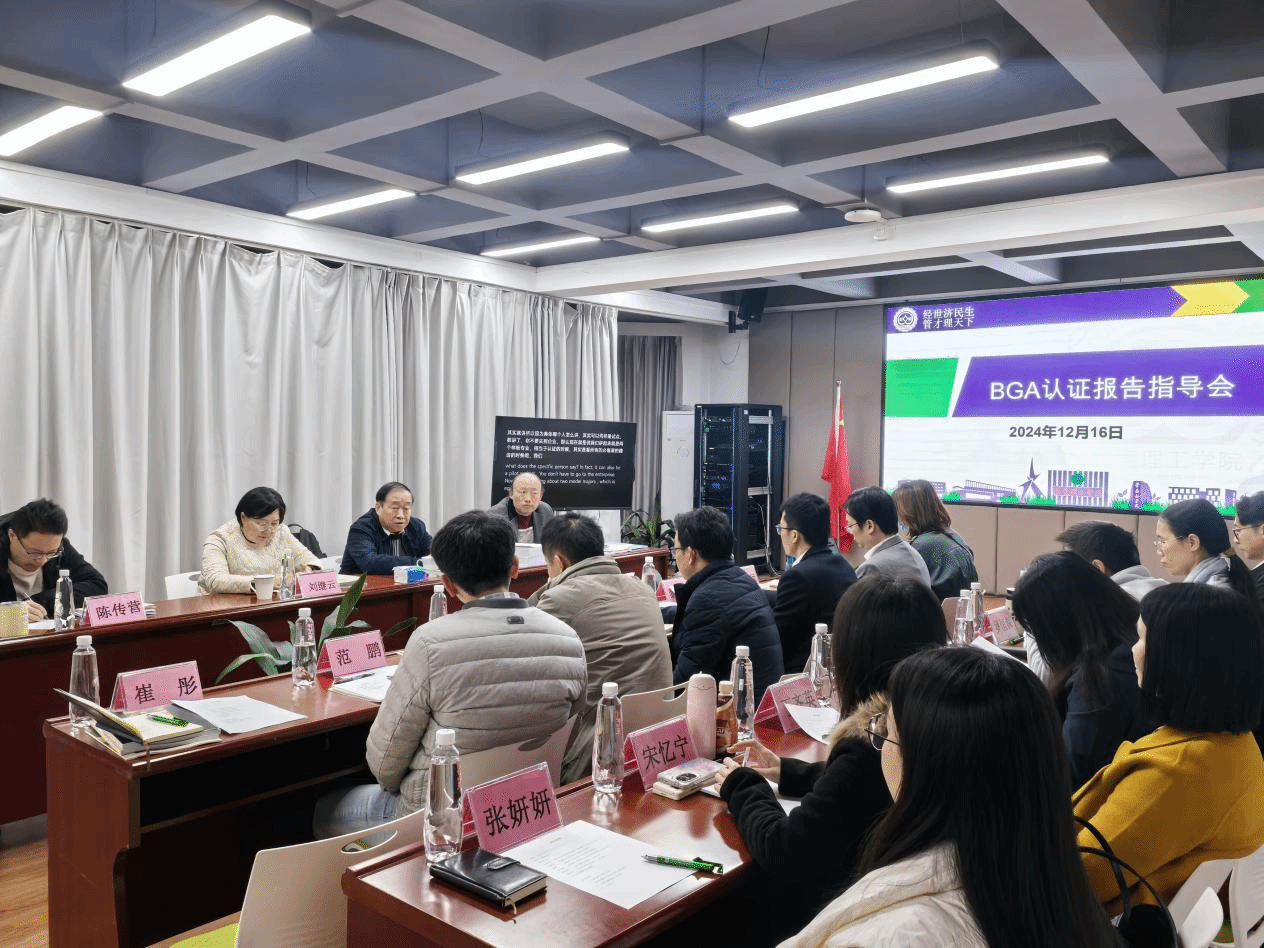 刘继云院长在会上对王重鸣教授的到来致以热烈的欢迎和感谢。她表示,王重鸣教授此次到访,将为学院开展BGA金牌认证工作提供宝贵的指导和支持,从而更好地推进认证工作,加速提升学院国际化水平。黎伟副院长基于王教授前期指导意见,从学院战略实施、人才培养、课程课件更新等BGA金牌认证阶段工作向王教授进行了详细汇报。