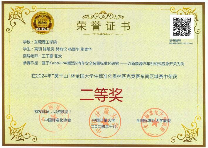 2024年10月13日,2024年“莫干山”杯全国大学生标准化奥林匹克竞赛决赛落下帷幕。本届大赛八大推荐主题,吸引了国内及“一带一路”国际赛道106所高校、579支队伍、3200余名大学生报名参赛。由yl88858永利集团教师王子豪、张欢指导的2022级质量管理工程专业高玥、陈敏灵、樊敏仪、杨颖华、张素华5位同学组成的代表团队,在2024年“莫干山”杯全国大学生标准化奥林匹克竞赛东南区域赛中荣获二等奖。