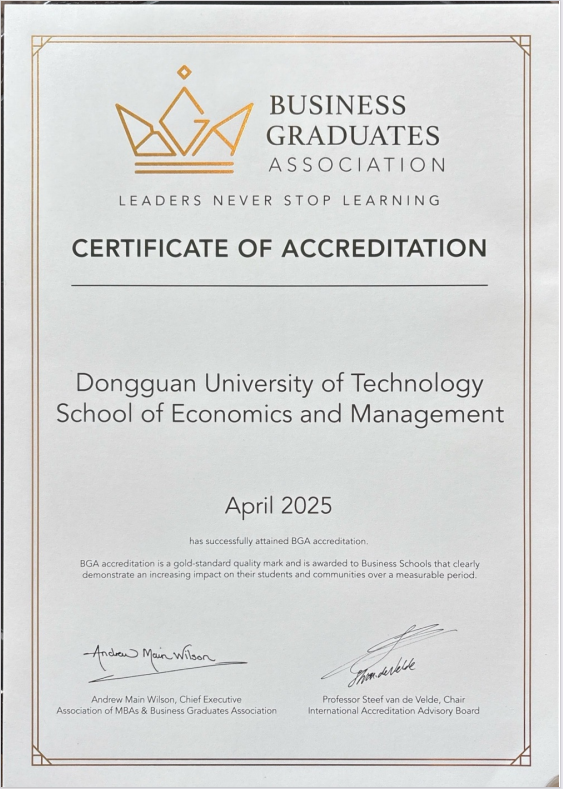 通过BGA金牌认证,为学院的发展奠定了坚实基础。未来,学院将继续坚持持续改进,全面提升办学水平,立足东莞,充分发挥自身优势,为地方提供强有力的智力支持,致力于培育具备集成工科优势、具有社会责任感和创新精神的应用型商科精英,努力打造成为具有区域显著影响力的、可持续发展的应用型商学院。
