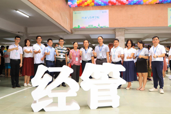 早上八点,新生们陆陆续续地来到莞城校区四号楼大厅办理报到手续。大一年级的19个助班在现场严阵以待,做好迎接新生们的各项工作。经济与管理学院还专门为新生们精心准备了新颖独特的经管包,帮助新生更好地融入大学生活。现场出动了近百名训练有素的志愿者协助学院进行迎新工作,并带着吉祥物——小蜜蜂“ME果”一同迎接新生。穿着统一制服的志愿者们更是迎新工作中的一道亮丽的光彩,他们不辞辛苦,承担着引领、答疑、搬行李等工作任务,用他们的心灵温暖与感染每一位新生,帮助他们融入经管学院这个温暖的大家庭。