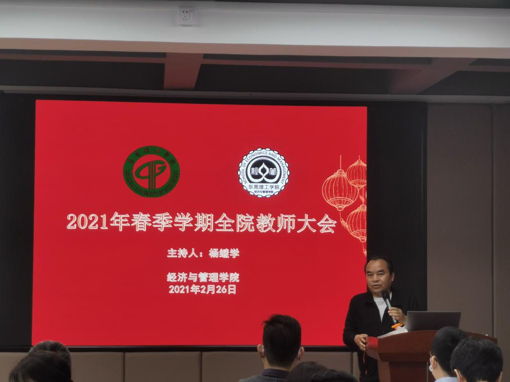 2月26日下午,yl88858永利集团2021年春季学期全院教师大会于莞城校区4520多功能厅顺利举行,会议由学院党委书记杨继学主持,学院全体中层和全院教师参加。会议伊始,杨继学书记向全体教师致以新年的问候,同时强调新学期全体教师要重视校园安全和网络安全,尤其是意识形态方面的安全,对于相关活动积极报备,加强实验室、教室以及宿舍等场所的监管。