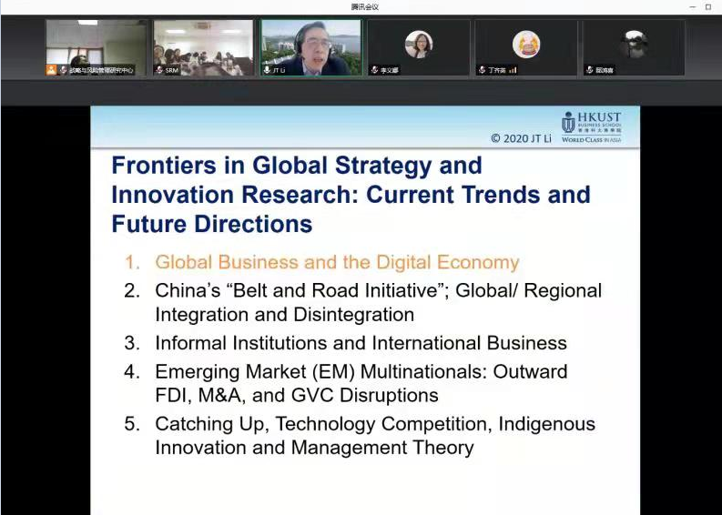 2021年12月29日,应经济与管理学院柔性杰出人才魏玖长教授的邀请,经管学院刘川、黎伟、陈永栓、丁齐英等30多位老师参加了“Strategies for Digital Platform Owners to Enter Complementary Markets”国际学术研讨会。教育部国家级高层次人才讲座教授、Journal of International Business Studies副主编、香港科技大学李家涛教授,在腾讯会议平台作了线上主题报告。