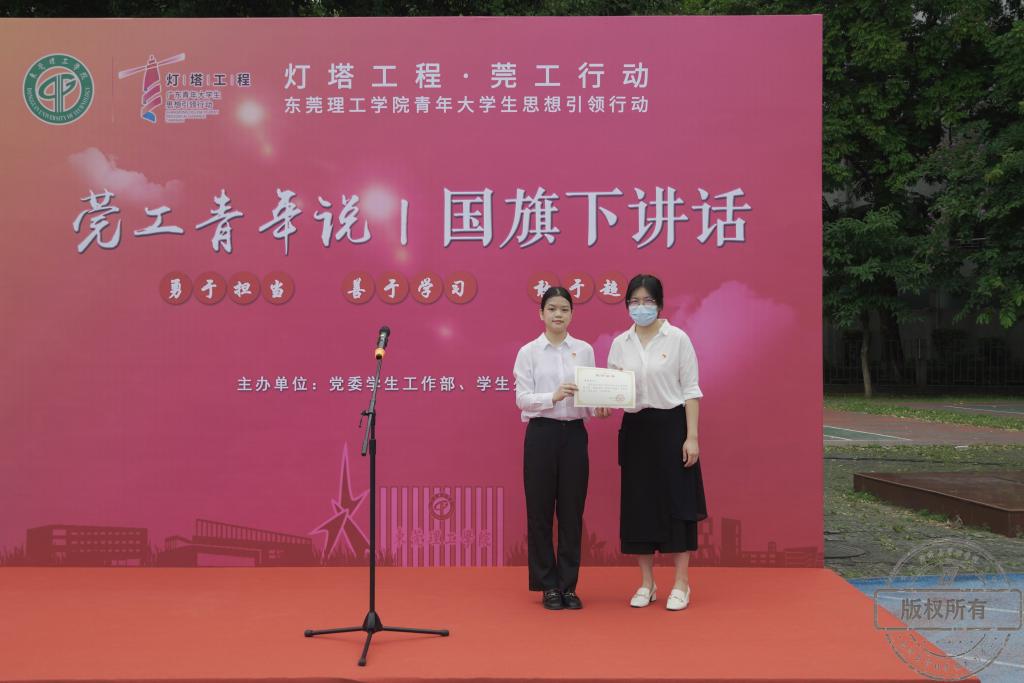 升旗过后,经济与管理学院2018级工商管理1班方少生同学登上莞工青年说的舞台,在国旗下从“以赛促学”、“勤勉自律”、“知行合一”三个方面回忆了她与莞工的故事。在四年的大学生活里,她在竞赛中不断巩固所学,用非凡的勤奋实现了自我提升;在yl9193永利集团中,她积极向党组织靠近,并主动担当起莞工青年服务校园、服务师生的责任;在校招面试时,她发现企业更看重有较强的自学能力,能够做到理论与实践相结合的候选人。她表示,在毕业后也会牢记莞工“学而知不足”的校训,不断严格要求自己。最后,她对大学四年支持帮助她的老师、同学们表示了感谢。同时,她期待同学们能找到适合的道路,种下梦想的种子,用勤奋的汗水浇灌,不负韶华。