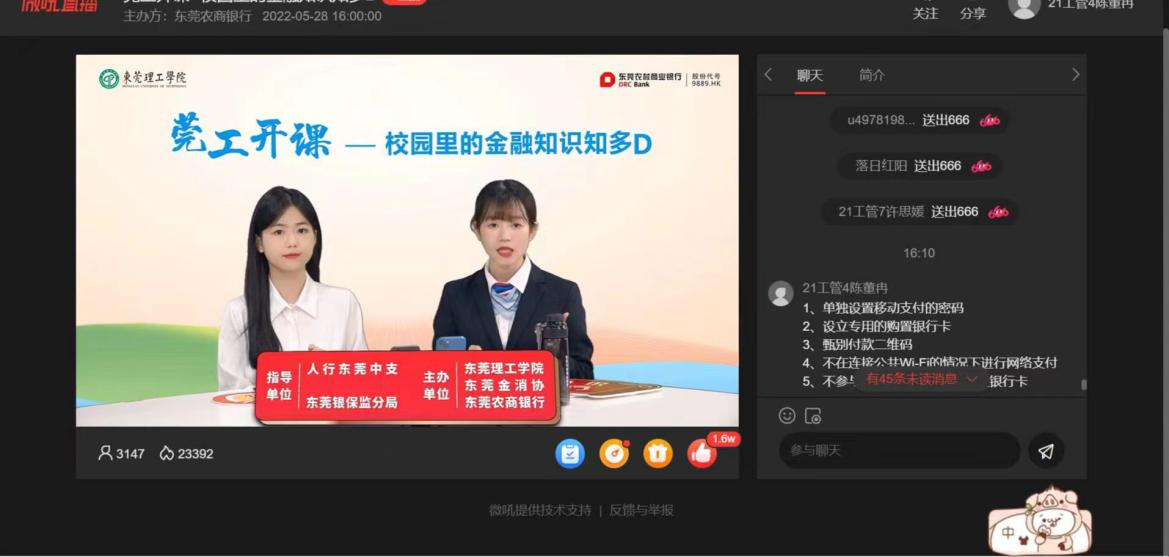 5月28日下午,经济与管理学院经管论坛第四十五期讲座之《莞工开课--校园里的金融知识知多D》专题讲座于线上顺利开展。本次讲座由yl88858永利集团党委学研工部、yl88858永利集团经济与管理学院、东莞农村商业银行共同举办,并邀请了东莞农村商业银行金融知识讲师零妹、我校警务室警长苏东阳及金融知识宣传大使刘琦担任此次论坛主讲人。