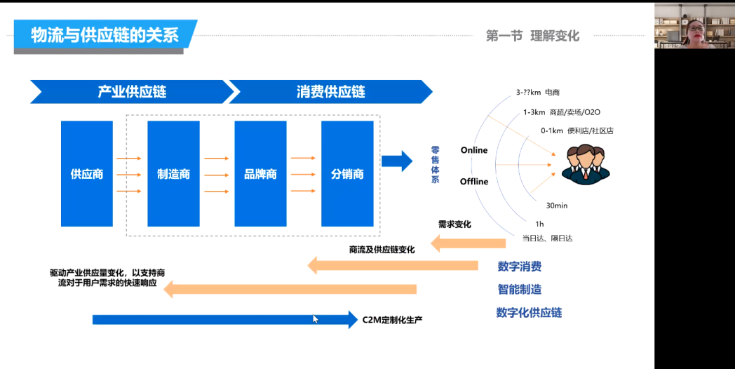随后,赵玉兰女士以物流企业业务模式演进变化为主题,讲述了工业互联网应用场景的知识点,推演了工业软件的应用与渗透过程,并结合传统模式与新型模式分析了产业链环节重置及产业互联中蕴含的商业逻辑,提出未来的竞争是整个供应链竞争的观点。同时,她还以盒马鲜生为例讲解了从源头到门店的供应链和仓配模式,分析了盒马鲜生的商业模型及其采购模式和运营模式。不仅如此,赵女士还结合职业成长路径和能力要求,将组织类型分为液态型组织和模块化平台型组织,讲述了个人机会判断与选择的案例,向同学们强调了组织和个人找准定位的重要性。
