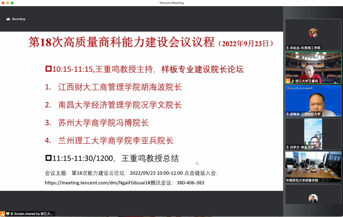 9月23日,经管学院领导班子与认证相关教师在线参加AMBA&BGA中国成员院校第18次高质量商科能力建设研讨会。会议由浙江大学王重鸣教授主持,上百位全国各成员院校教师同时参与,会中邀请通过认证院校院长就样板专业建设进行主题报告。