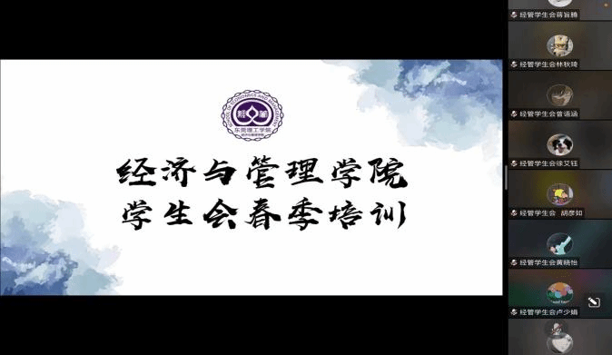 为深入贯彻落实党的二十大精神以及习近平总书记关于青年工作的重要思想,巩固深化新时代高校学生会改革和建设,提高学院学生会组织工作人员的工作素养和业务能力,2023年4月11日晚经济与管理学院学生会于线上开展了春季学生会培训工作会议。学院学生会秘书长黄雅莉老师、学院学生会全体工作人员参加了本次培训。本次培训主要学习党的二十大精神、全国两会精神、习近平总书记在庆祝中国共产主义青年团成立100周年大会上的重要讲话精神等内容,培训由孙家钰主持。