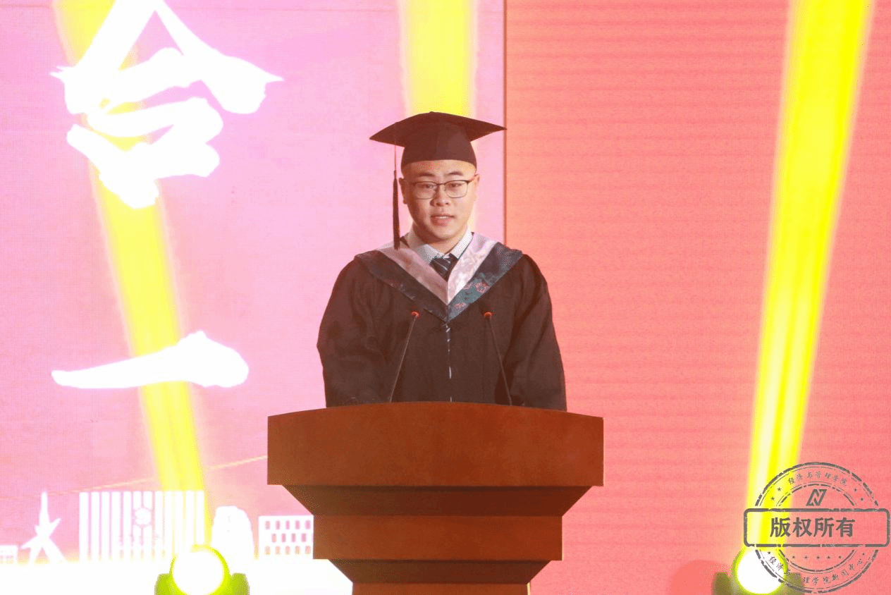 即将赴英国伦敦大学学院进修的19级国际商务产学国际1班的邹裕民同学,代表毕业生上台发言,他回忆了在大学中从懵懂走向成熟,从浅薄走向充实的成长之路。他表示,在莞工学习的四年是自己在曲折中不断收获并逐渐成长的四年,在这四年里见证了莞工的高速发展,并对学校领导、老师表达感谢,对同学们、母校表示祝福,并期待未来的经管学院韶华依旧、人才辈出。