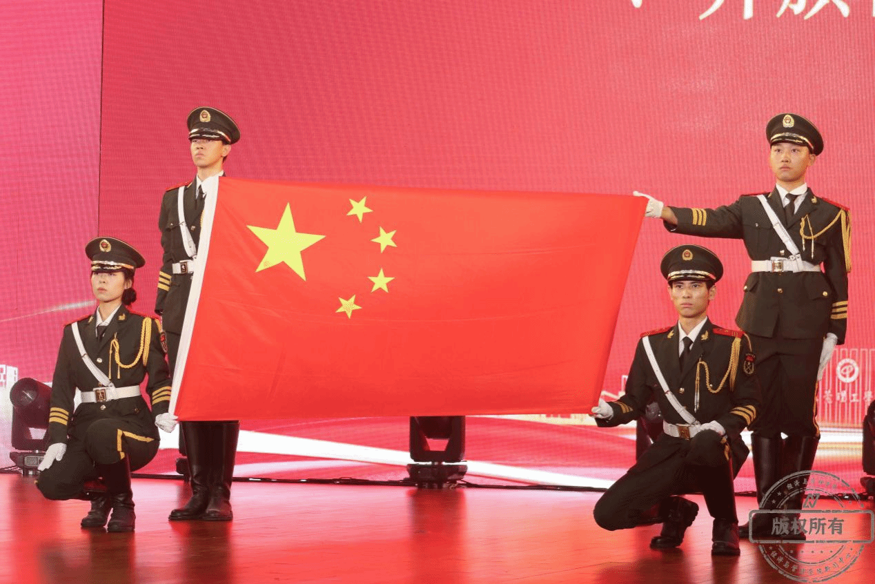 随着国旗护卫队护送国旗进场,典礼正式开始,全体人员肃然起立,面向国旗,高唱国歌。