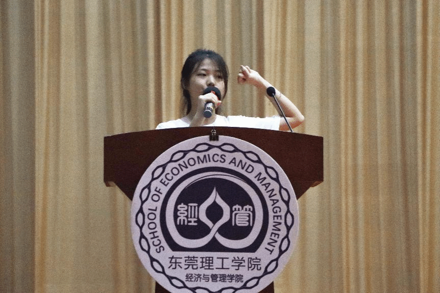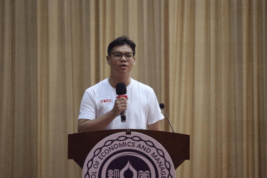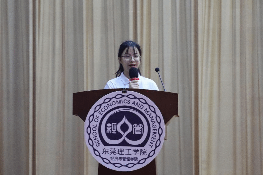 随即,23工商管理5班新生代表李龙辉上台发言,他提到,自己很荣幸能够来到经管学院,同时其阐释到当下青年对中国发展的重要程度,呼吁我校学子应树立理想信念,铭记“学而知不足”的校训,成为一名出色的经管人、莞工人。