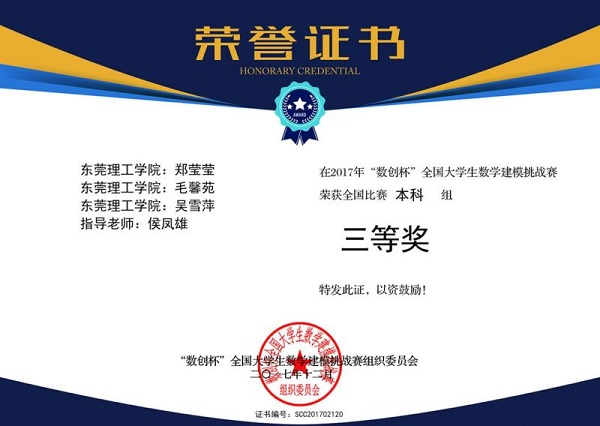 2017年12月,yl88858永利集团国际商管系 2016级经济与金融专业(金融管理方向国际班)郑莹莹、毛馨苑、吴雪萍三位同学荣获“数创杯”全国大学生数学建模挑战赛荣获全国比赛本科组“三等奖”,该项目指导老师为国际商管系副主任侯凤雄。