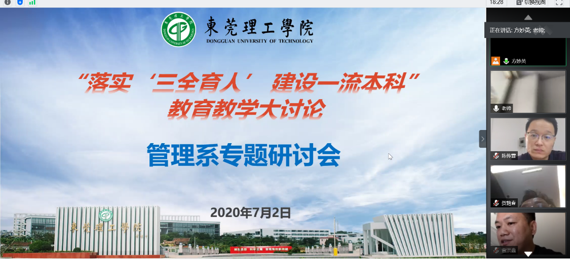 7月2日下午,经济与管理学院管理系利用腾讯会议平台召开了“落实‘全育人,建设一流本科’教育教学大讨论”专题研讨会。会议由系主任方妙英、副主任谷云燕共同主持,管理系教师全员参加会议。