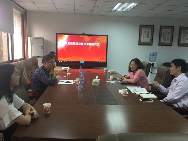 东莞报业传媒集团拥有《东莞日报》、《东莞时报》、东莞时间网、东莞日报手机报、《看东莞》杂志等5个子媒以及东莞市万家通报刊发行物流有限公司、东莞报业文化传播有限公司、东莞市捷报泉食品有限公司等8家经营公司,是东莞本土的主流媒体集团。吴新辉从东莞品牌榜、东莞品牌大讲堂、东莞企业品牌推广扶植等方面谈了东莞报业传媒集团在东莞品牌建设方面进行的工作并表达了在以上方面与质量院合作的意愿。刘继云介绍了质量院在品牌建设方面开展的工作,表示在东莞品牌大讲堂、东莞企业品牌推广扶植方面可以与东莞报业传媒集团开展合作,发挥双方的优势,更好地推进东莞品牌建设工作。叶柱棠介绍了东莞市质量与技术监督局开展的品牌建设工作,表示东莞品牌大讲堂可以与质量院拟开展的质量大讲堂合作,向企业和社会宣传质量品牌建设理念和经验,推进全市的质量品牌建设工作。