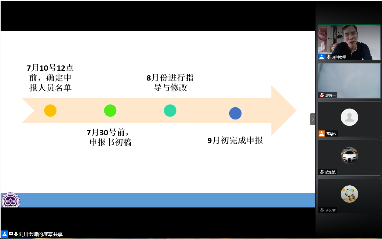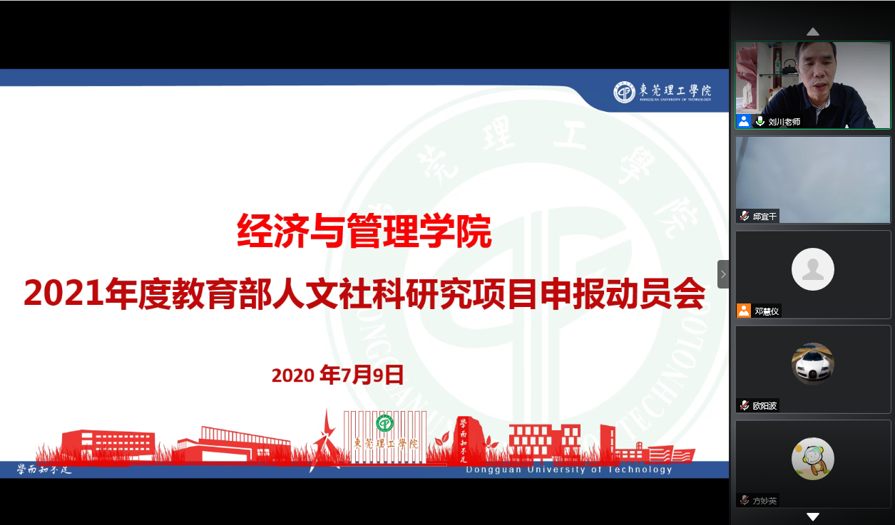 7月9日下午,经济与管理学院在腾讯会议(腾讯会议ID:401 946 732)召开了2021年度教育部人文社科研究项目申报动员会。动员会由刘川副院长主持,经管学院符合2021年度教育部人文社科研究项目申报老师参与。