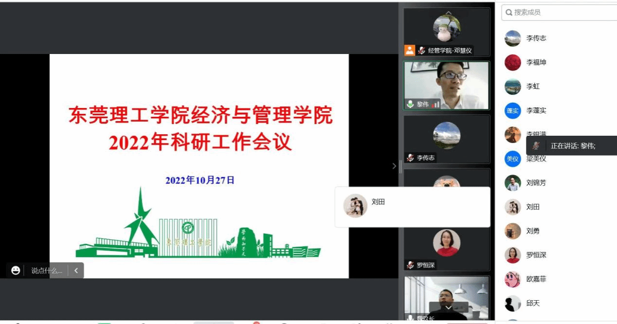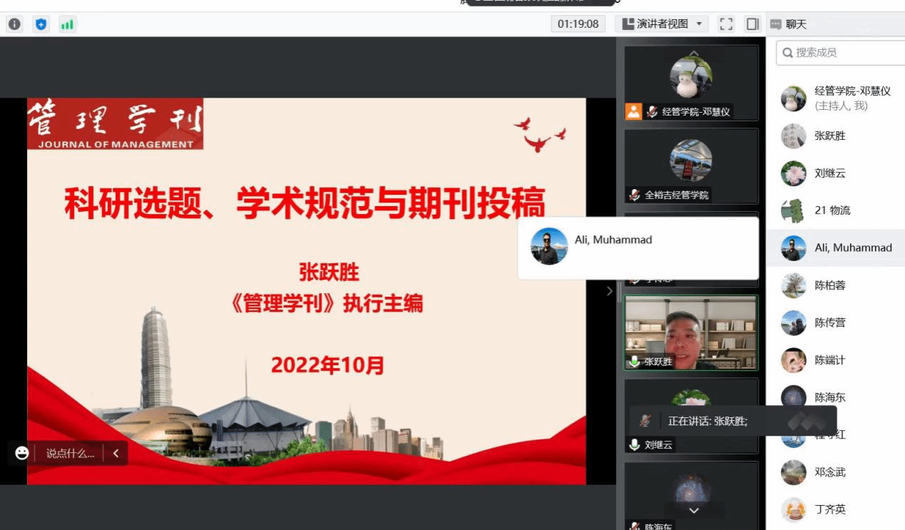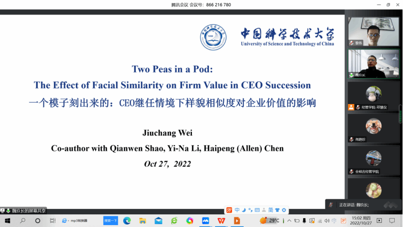2022年10月27日下午,经济与管理学院举行2022年科研工作会议,受疫情影响,本次工作会议在腾讯会议(ID:866-216-780)线上举行。会议由经济与管理学院副院长黎伟主持,共进行了两个报告,分别为由中国科学技术大学讲席教授魏玖长带来的《CEO继任情境下样貌相似度对企业价值的影响》和由《管理学刊》执行主编马跃胜带来的《学术论文与投稿》。