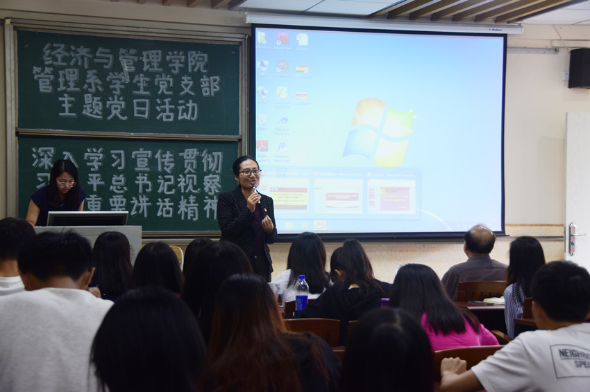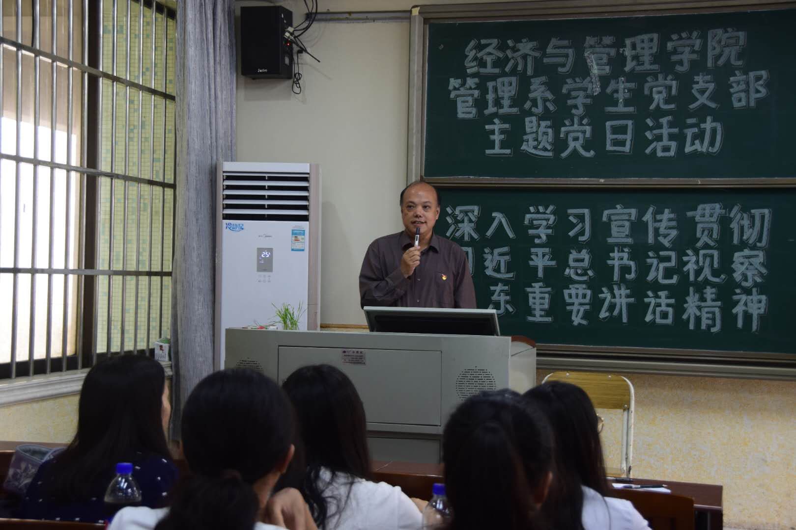 2018年12月6日下午,经济与管理学院管理系学生党支部在莞城校区教室3308开展主题党日。由校党委副书记吕琦元作深入学习宣传贯彻习近平总书记视察广东重要讲话精神的报告,经管学院党总支副书记劳丹,辅导员张新建、邓毅青以及支部学生党员、入党积极分子参加了此次主题党日。