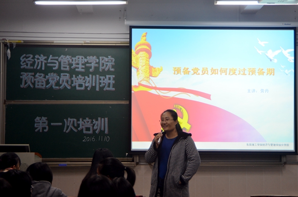 2016年11月10日下午,经济与管理学院于莞城校区2209教室举行预备党员培训班第一讲,yl88858永利集团党总支副书记劳丹担任主讲嘉宾。
