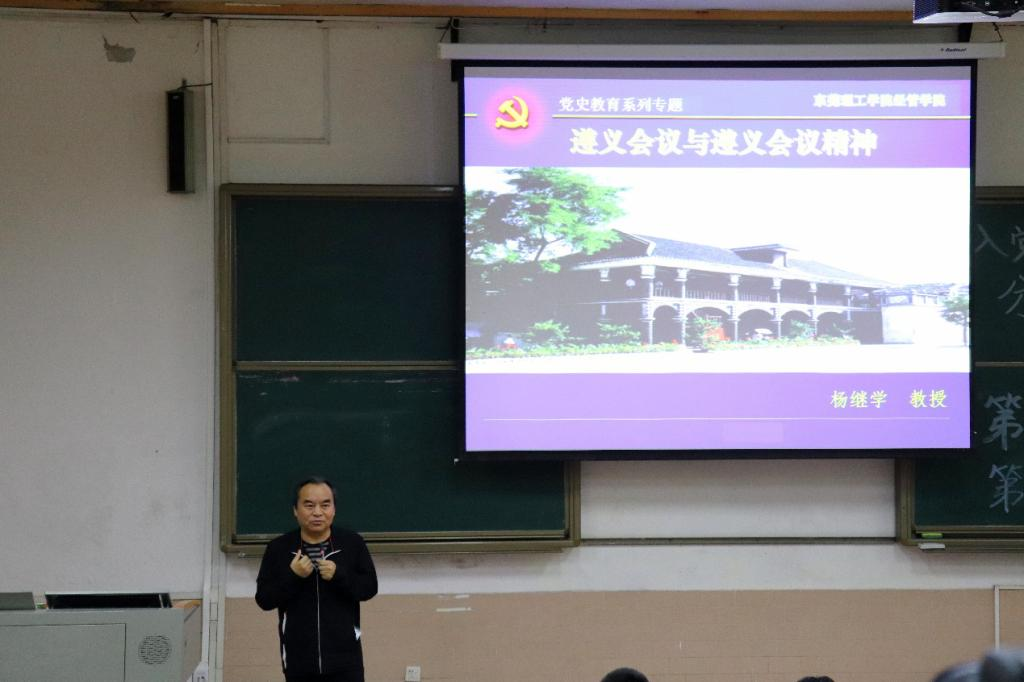 开班典礼过后,学院党委书记杨继学讲授分党课第一课《遵义会议与遵义会议精神》,杨书记从遵义会议召开的背景、过程、历史地位和精神启示四方面讲授,并指出,遵义会议是确定了以毛泽东为核心的党中央的正确领导,是中国共产党第一次独立自主运用马列主义基本原理解决自己的路线、方针和政策的会议。启发同学们要坚持改革创新、敢闯敢拼、自立自强、努力拼搏,做到回眸历史、展望未来,不忘初心、牢记使命,传承弘扬、指导实践。