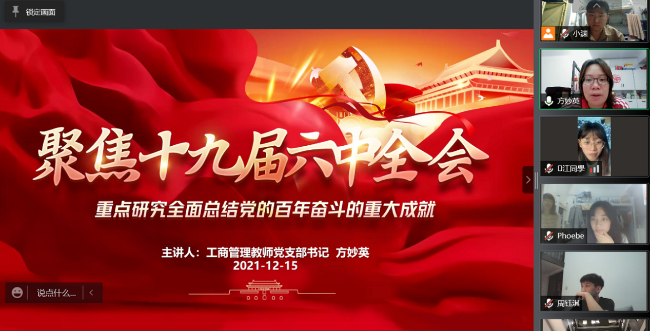 受新冠疫情影响,2021年12月15日晚,工商管理系教师党支部方妙英书记以《无愧使命担当,不负伟大梦想——学习贯彻党的十九届六中全会精神》为题,借助腾讯会议平台,为2018级人力资源管理专业1班同学讲授了一场思想深刻、立意高远的线上党课。