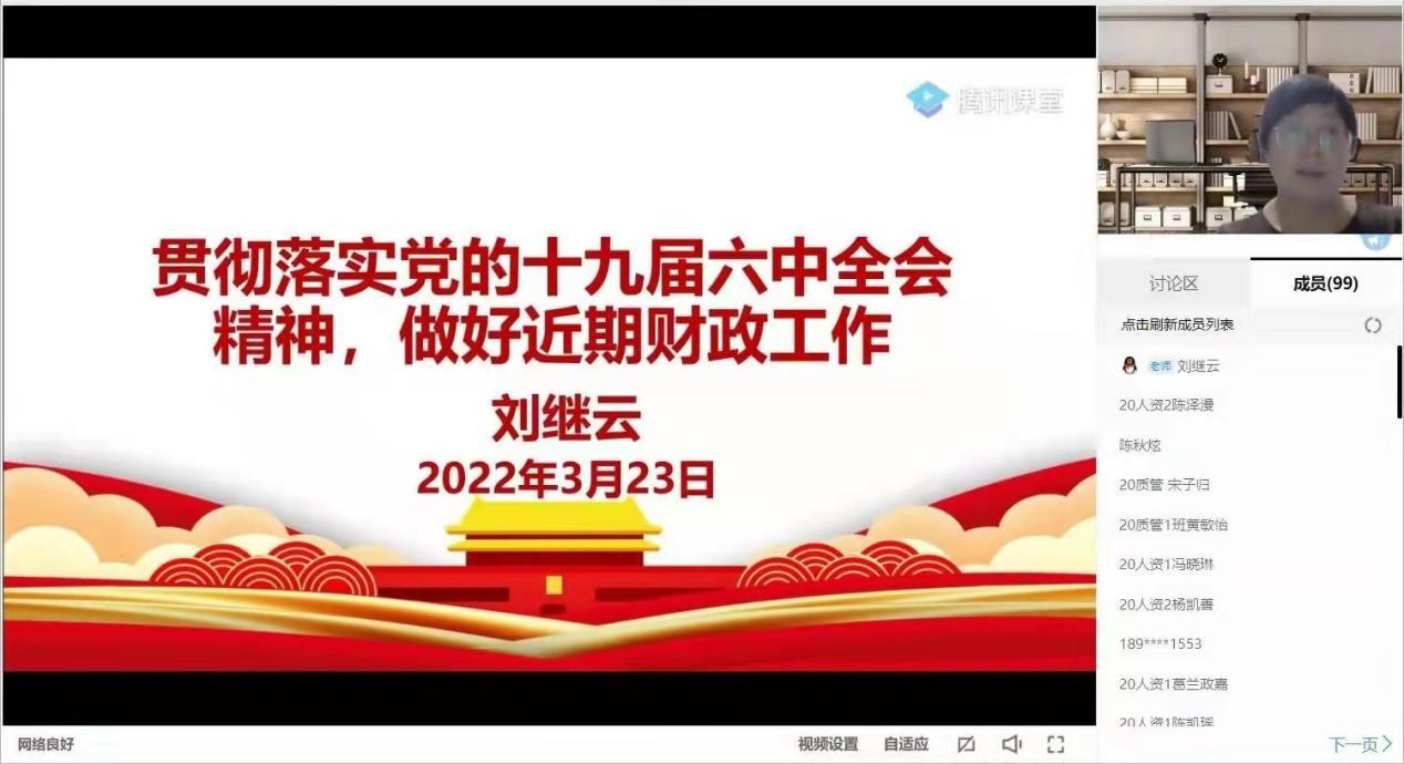 学院院长刘继云以“贯彻落实党的十九届六中全会精神,做好近期财政工作”为题,紧贴社会发展实际,充分运用2021年财政工作成果、当前疫情防控工作下的民生热点问题等典型素材,为同学们系统阐述和深入解读了党的十九届六中全会精神。她鼓励同学们要时刻关注国际形势,了解社会形势,学好本领,从党的十九届六中全会精神中汲取奋战新征程的智慧和力量。
