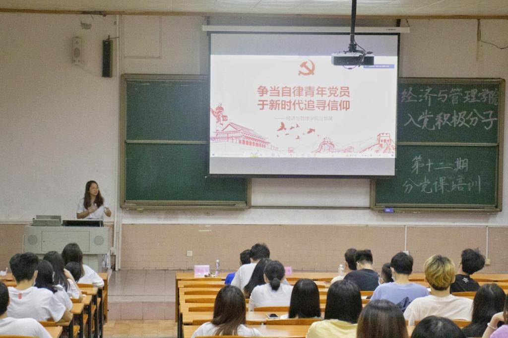 6月9日,经济与管理学院第十二期入党积极分子培训班第五课在莞城校区5#1阶梯教室顺利开讲。本次分党课由经济与管理学院党委宣传委员、工商管理系学生第四党支部书记邓毅青担任主讲人,面向经济与管理学院第十二期入党积极分子授课,并全体学生党员同步进行线上授课。