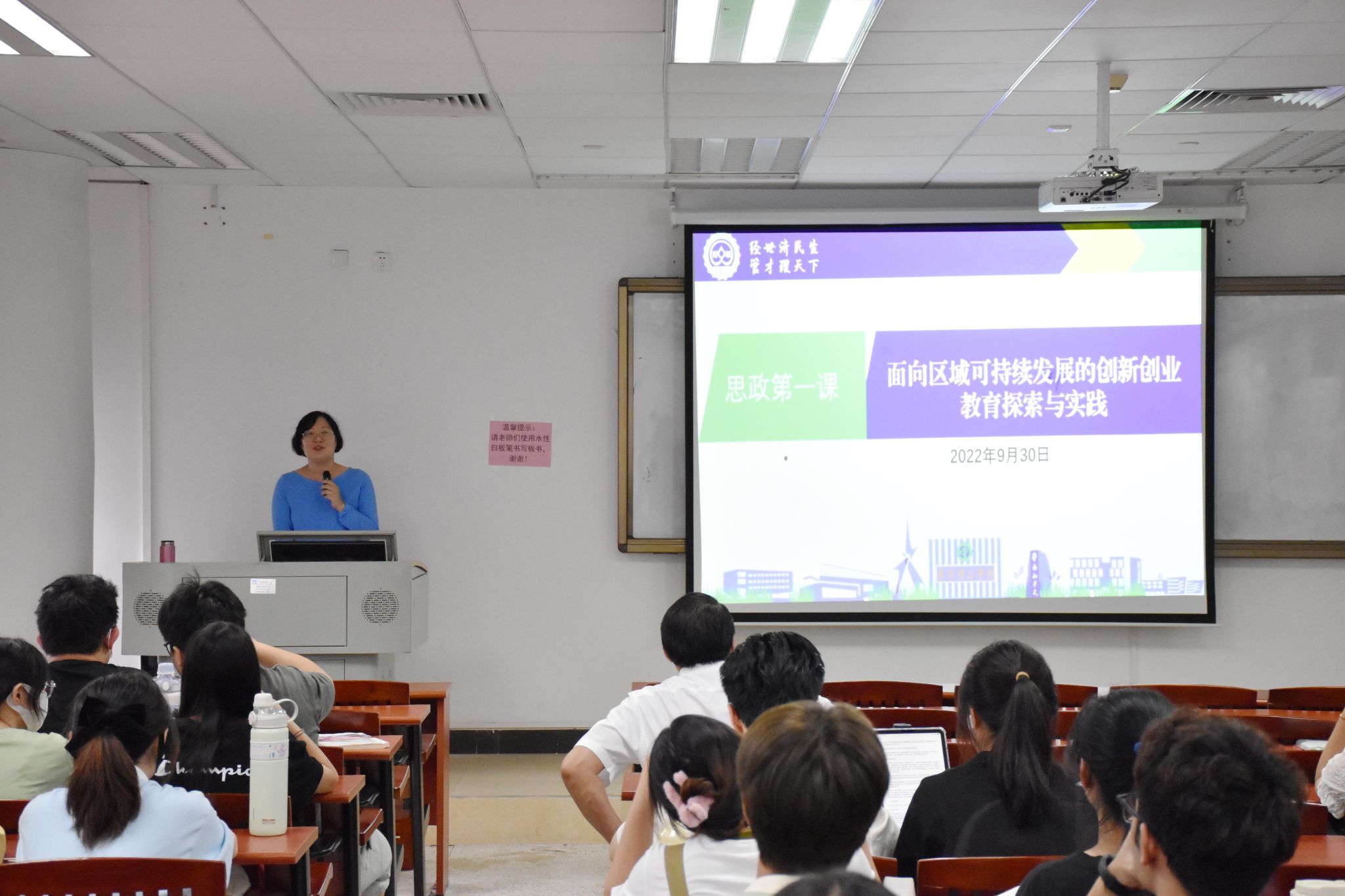 2022年9月30日上午,经济与管理学院院长刘继云在莞城校区图书馆T407课室为2021级物流工程1、2班的同学讲授本学期“思政第一课”。