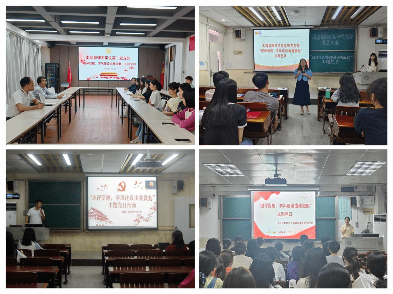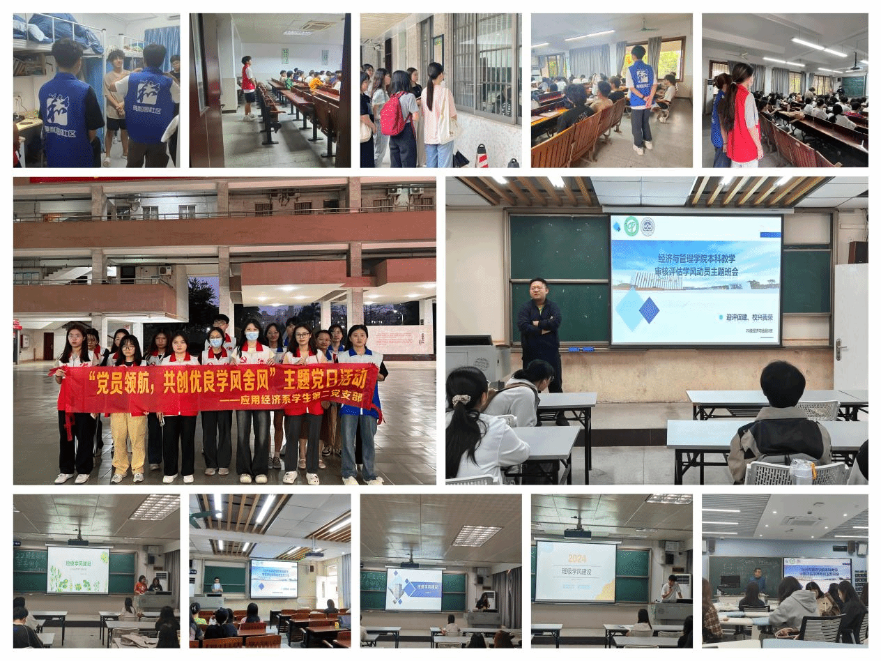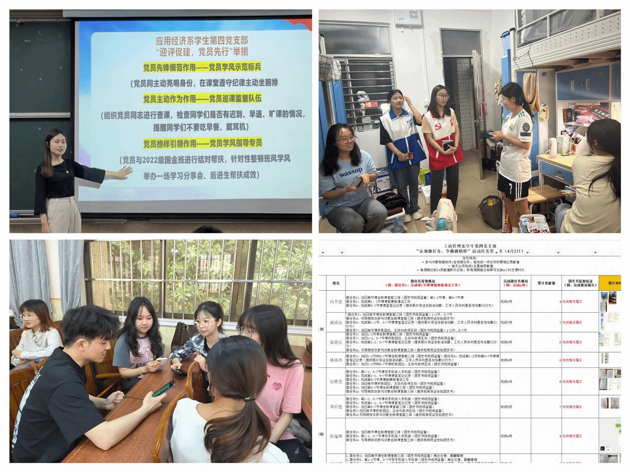 借助开展“迎评促建,学风建设由我做起”主题党日的契机,各支部创新学风建设方式方法,打造特色活动,动员广大党员参与到学风建设的工作中来。工商管理系学生第四党支部组织开展“认领微任务,争做微榜样”系列活动,通过党员认领“微任务”的方式带动身边的同学共同打造积极向上、自律自强的优良学风,并组织制作了学风建设宣传标语,为良好课堂环境的塑造添砖加瓦;应用经济系学生第二党支部聚焦社区学风建设关键点,连接“课堂”和“宿舍”两大场域,开展“党员领航,共创优良学风舍风”主题党日活动,在“教室督察”和”优秀学风舍风宣传”两大工作模块作出了特色。