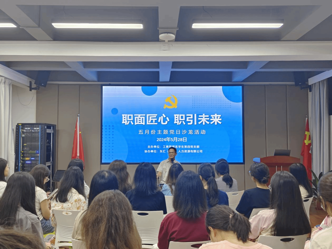 工匠精神,匠人为先。为引领支部党员进一步感悟匠心追梦对当代青年的重要意义,5月28日晚,工商管理系学生第四党支部与东汇(东莞)人力资源有限公司联合开展了“职面匠心 职引未来”主题沙龙,邀请到“广东螺丝工匠协会形象大使”黄任锋开展沙龙活动。他为同学们分享了他的“莞漂”故事,作为劳模工匠20余年坚持做好一件事的执着精神将大家折服。他用亲身经历激励在场同学,要不断挑战自己,用乐观态度面对生活,无论从事什么职业,干一行爱一行、专一行精一行,拼搏奋斗、持之以恒,同样也能实现人生价值,成为对社会有用的人。沙龙现场气氛热烈,引发师生浓厚交流热情,极大鼓励了在场党员和积极分子。