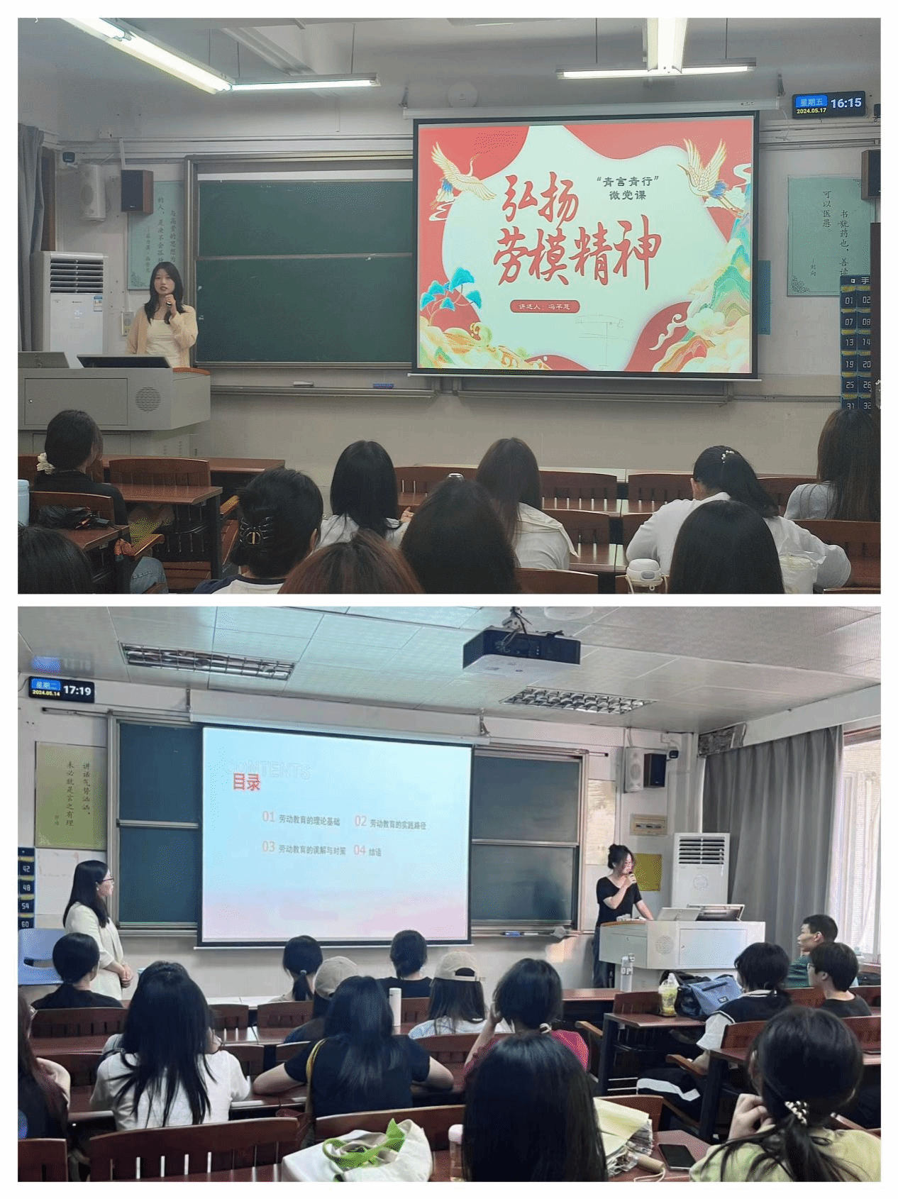 支部持续开展“青言青行”微党课。新时代,党和国家积极培育和打造“工匠精神”,基于此,支部紧紧把握“五一”国际劳动节契机,先后组织党员前往22人力资源管理1、2班开展“职面匠心 职引未来”理论宣讲,不断强化理论学习成效、带领更多同学理解工匠精神、劳模精神的时代价值。冯芊慈、黄娇洁等同志分别围绕劳模精神内涵、个人实习经历进行心得分享。他们在分享中提到,工匠精神的指向早已超越了工匠这个单一群体,体现为全体党员群众的实干创新和爱国奋斗。希望同学们笃定初心,践行、弘扬工匠精神、劳模精神,将专业所学、见习所闻、实习所得转化为工作激情和创造能力,共同参与新时代青春匠心接力赛。