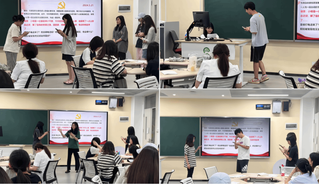 讨论结束后,各组同学分别展示了即兴创作的短剧,值得注意的是,各组均选择通过暗示与教育的方式感召“小明”主动坦白,争取宽大处理。短剧中,小明最终在党组织的帮助下,认识到错误并主动改正,切合《条例》精神,颇具现实意义。