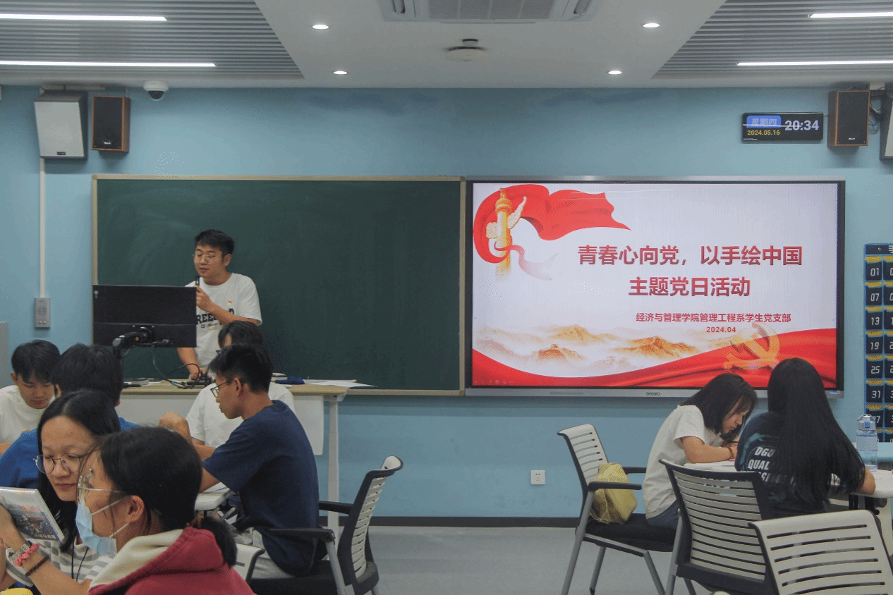 2024年4月25日晚,经济与管理学院管理工程系学生党支部于莞城校区3202教室顺利开展“青春心向党,以手绘中国”主题党日,本次党日活动由支部书记付中鑫主持,支部全体党员出席现场。