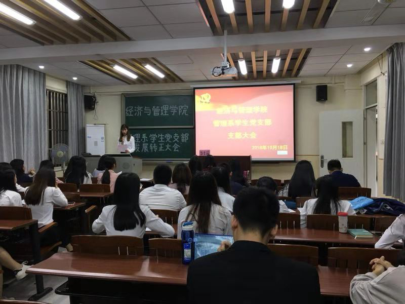 2018年10月18日下午,经济与管理学院管理系学生党支部于莞城校区3208课室召开全体党员大会。管理系学生党支部临时负责人邓毅青老师、辅导员张新建老师及全体学生党员出席了现场。