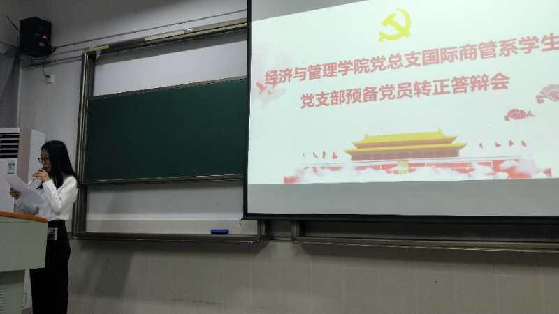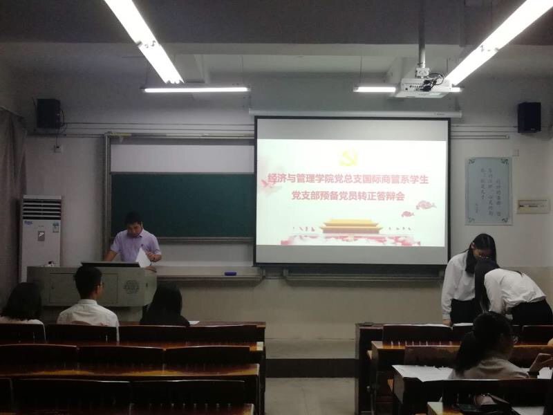 5月10日国际商管系学生党支部于莞城校区2209课室召开中共预备党员转正答辩会。对近期即将转正的三位中共预备党员开展了中共预备党员转正答辩会。国际商管系学生党支部书记邓武均同志主持答辩会。