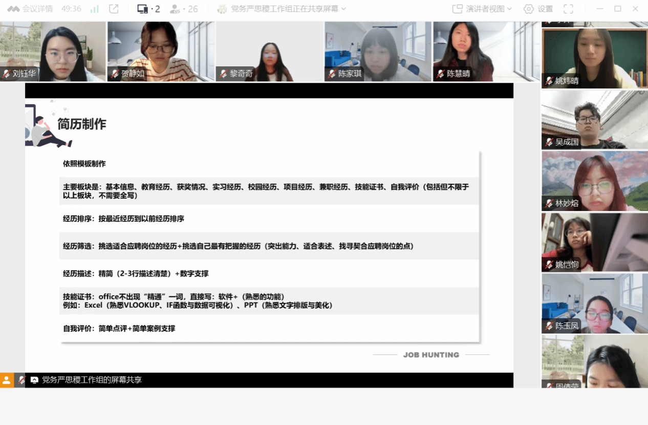 第二组代表陈嘉欣则分享了求职渠道的广泛探索,从常规的招聘网站、校园招聘到小众而高效的求职途径。她还特别推荐了一些针对会计专业的求职途径,如会计师事务所的官方网站、财务行业的专业论坛等。第一组代表欧美琳细致入微地介绍了考公考研的备考计划,从精选备考资料、科学规划学习时间,到调整备考心态为有考公考研意向的党员提供清晰的备考思路。