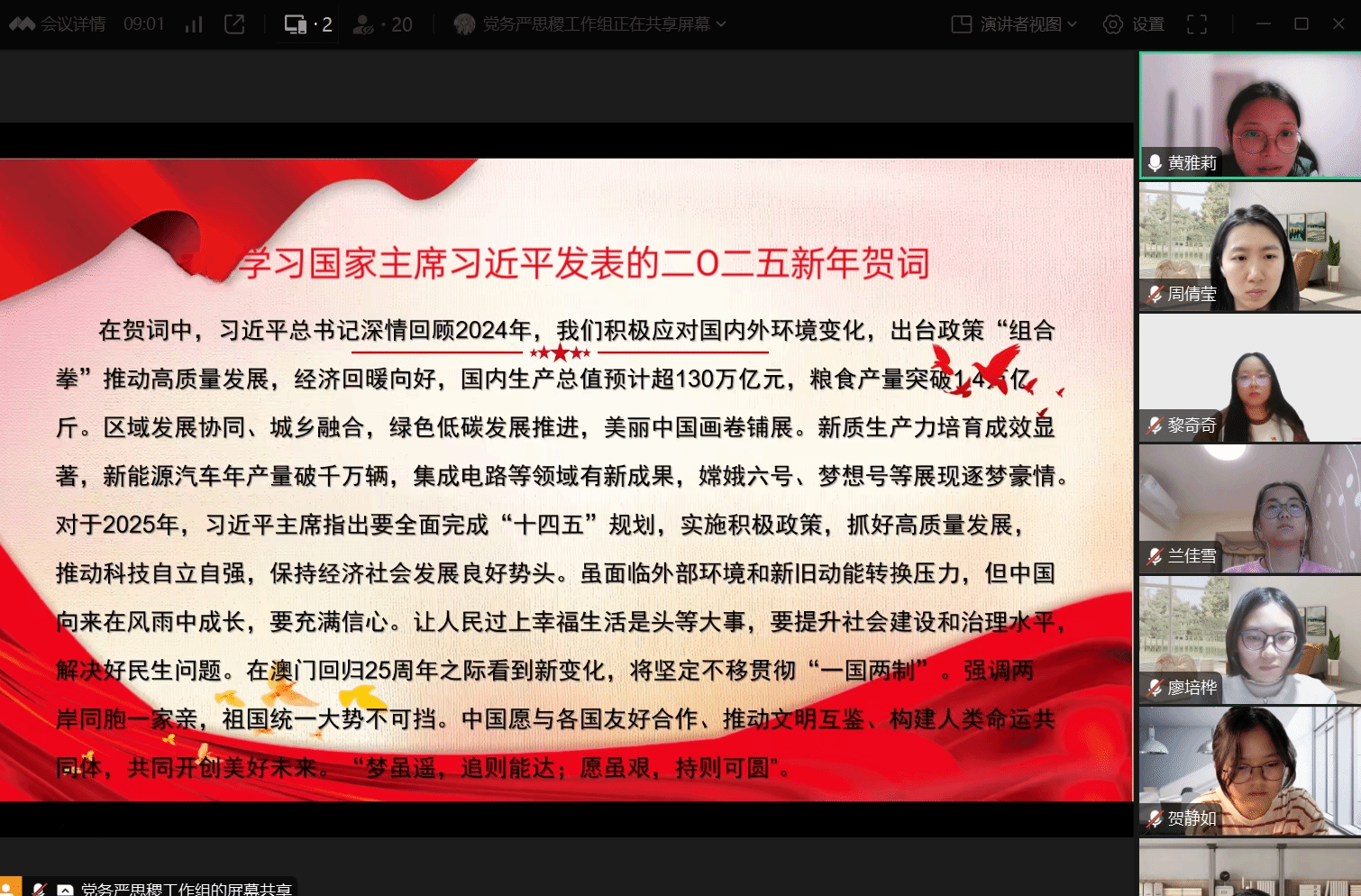 活动伊始,支部书记黄雅莉同志带领全体党员深入学习国家主席习近平二〇二五年新年贺词精神,引导党员深刻领会“让人民过上幸福生活是头等大事”“年轻人能有更多发展机会”等重要精神内涵,明确自身在就业与国家发展中的责任担当,并鼓励党员们积极投身会计专业相关领域,为国家经济发展贡献力量。