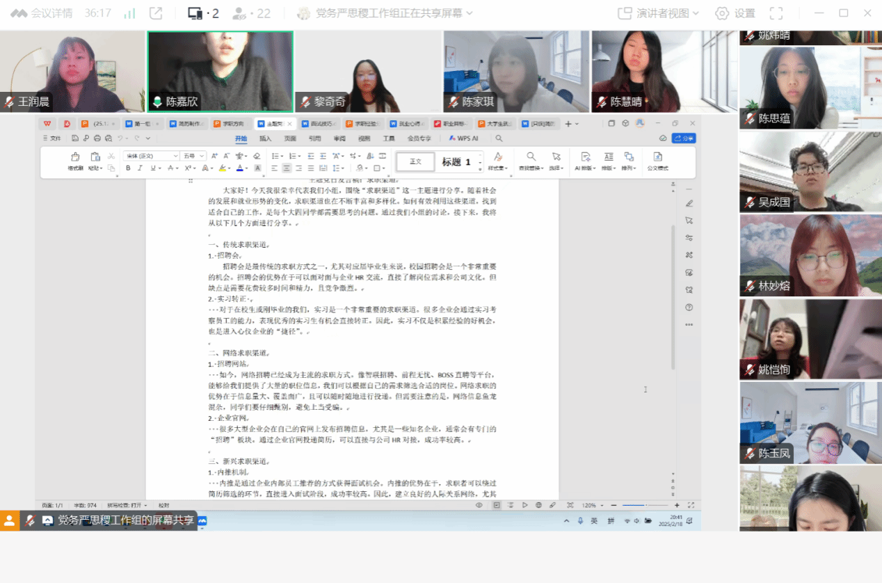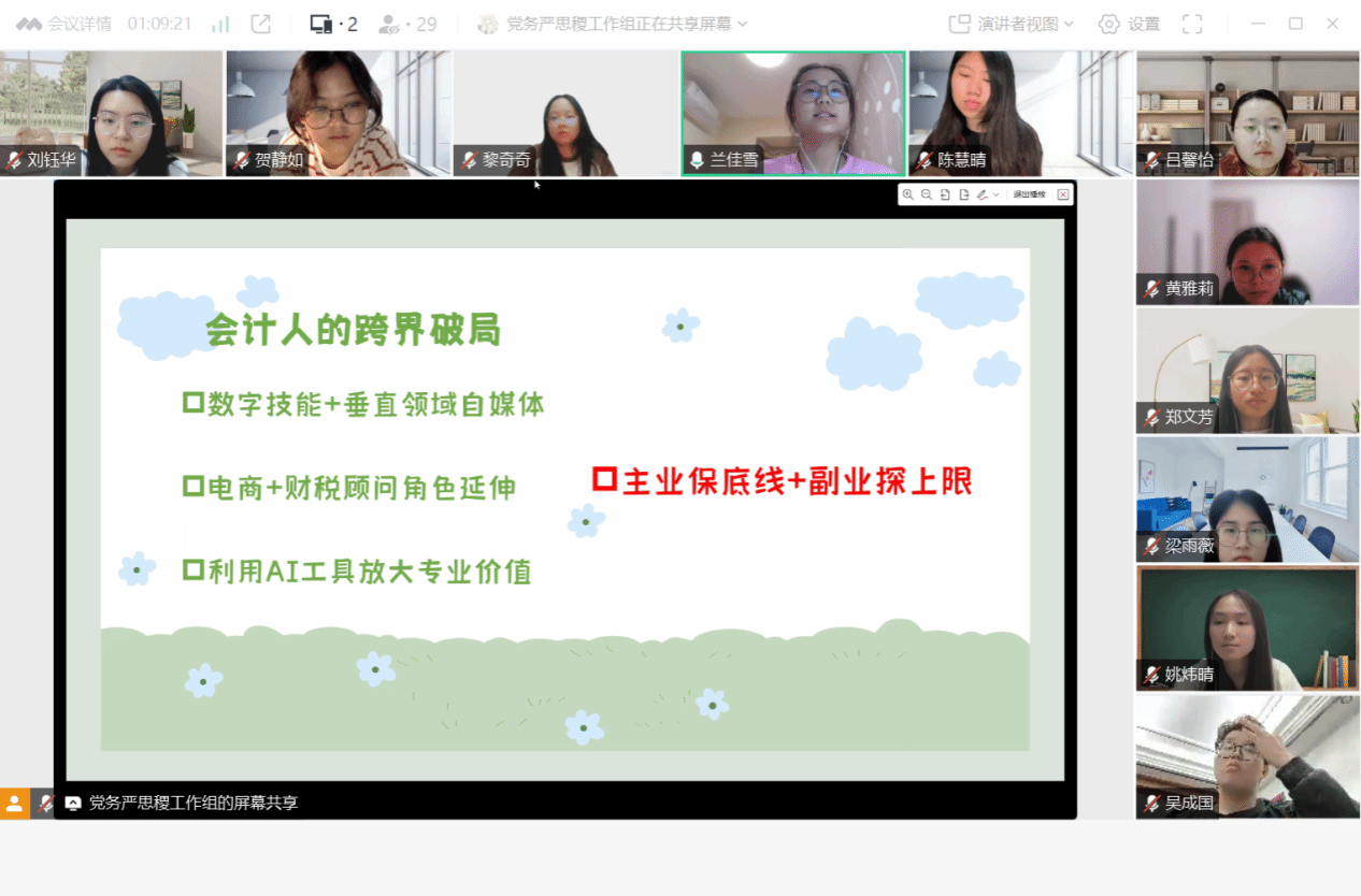 此次主题党日充分发挥了基层党组织在党员就业指导和职业发展中的引领作用,针对会计专业的就业指导内容丰富、实用,党员们在活动中积极分享、深入交流,不仅为自身职业发展积累了经验,也通过实际行动影响和带动身边同学积极就业、高质量就业,展现了新时代青年党员的责任与担当。
