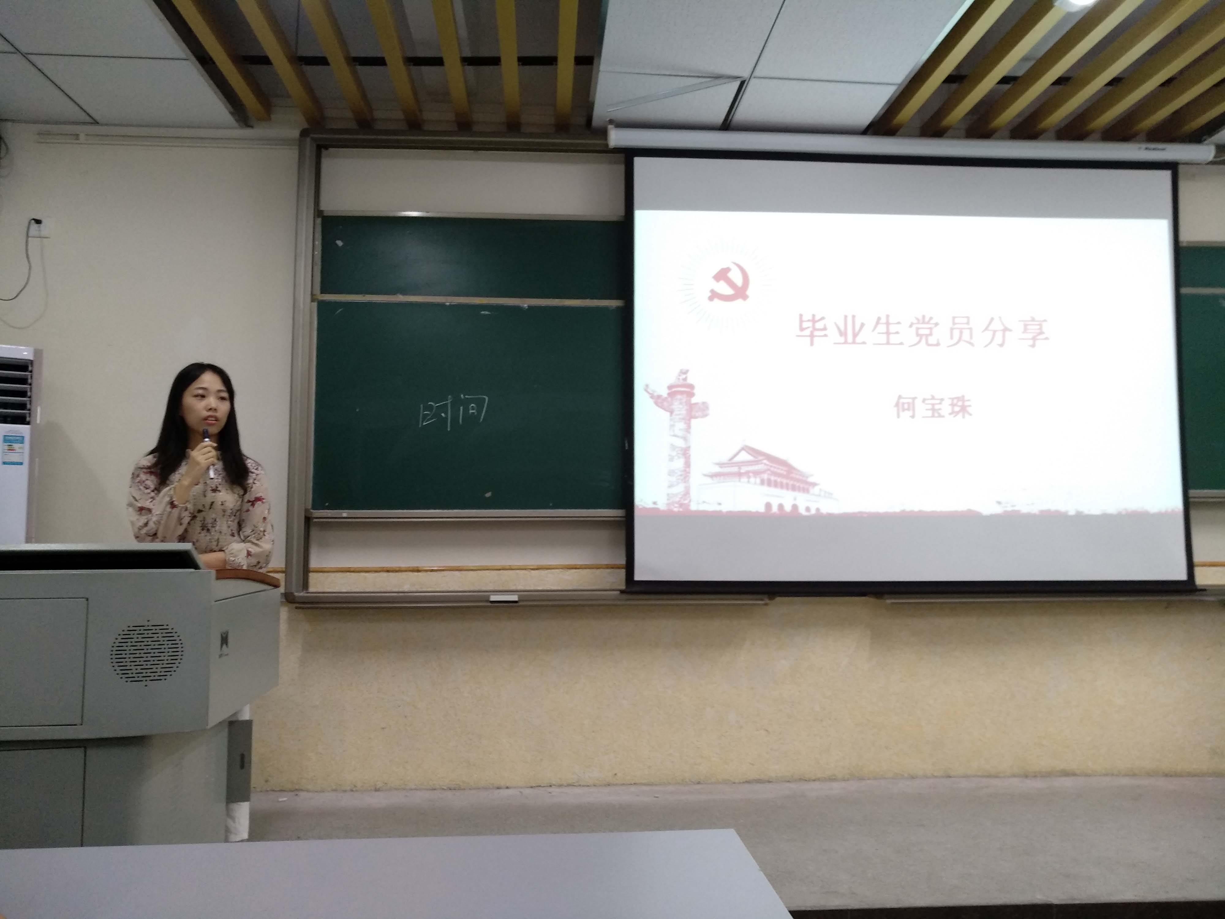梁嘉琪同志分享如何利用大学时光严格要求自己成为一名合格的中共党员。她指出,作为一名学生党员,需要合理规划和定位大学目标,发挥党员的先进性,加倍努力掌握更多技能,同时不忘培养良好的生活、学习习惯,时刻保持党员积极向上的精神风貌。何宝珠同志学分享大学生如何做好就业选择,清楚归纳了国贸专业的基本就业范围,为迷茫的同学们指点迷津,充分发挥了优秀党员的模范作用。