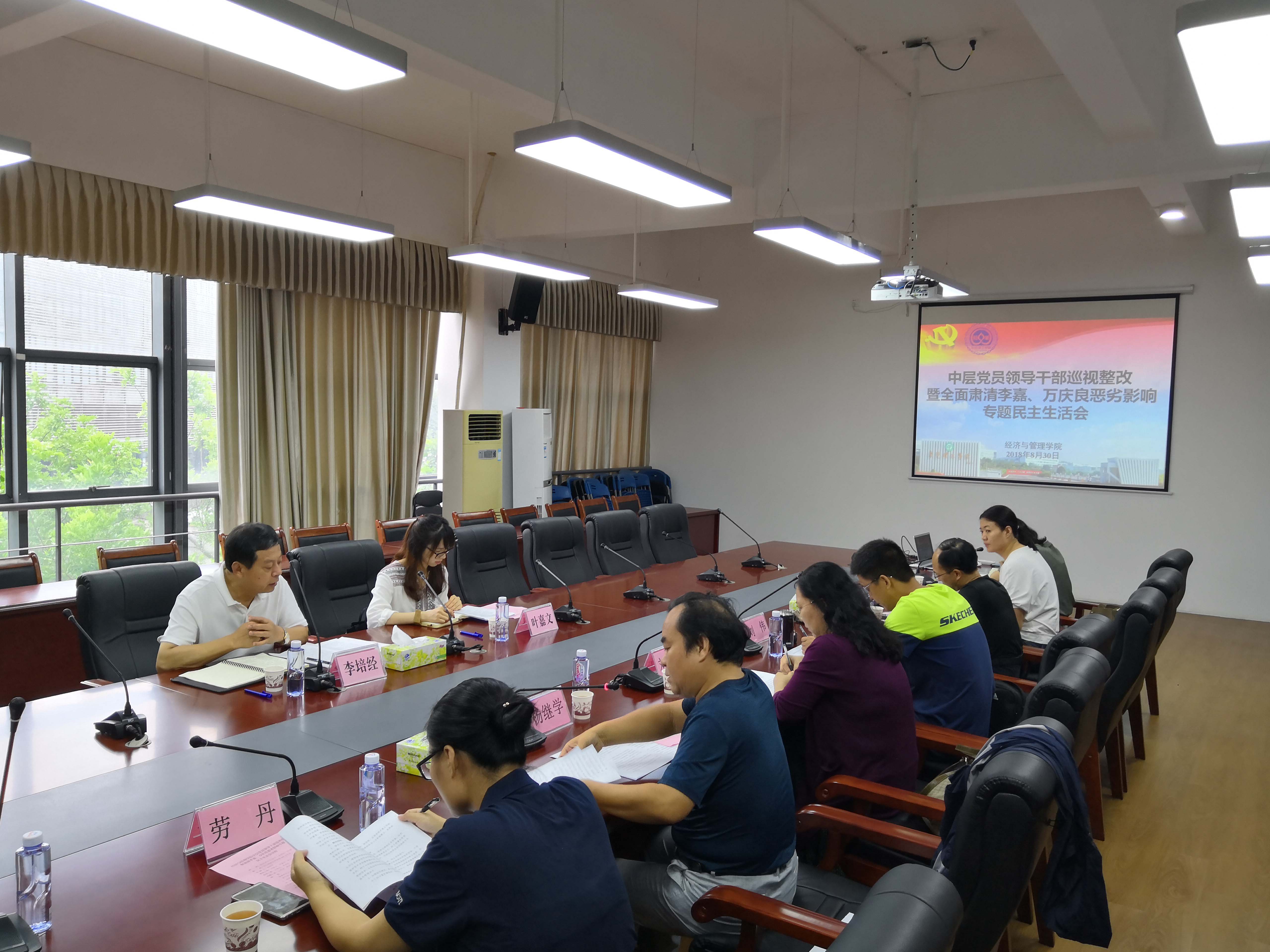 8月30日,根据学校党委的统一部署要求,经济与管理学院党总支召开中层党员领导干部巡视整改暨肃清李嘉、万庆良恶劣影响专题民主生活会。校指导组有关同志到会指导。总支组织委员、党支部书记等列席了会议。